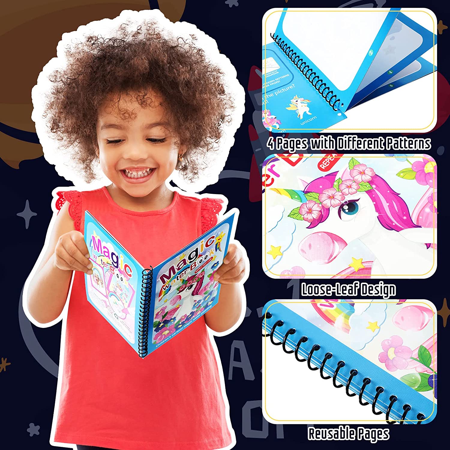 Magical water books use unique reusable water-reveal mechanic on the page. This allows anybody to color the images into visibility by using just water.