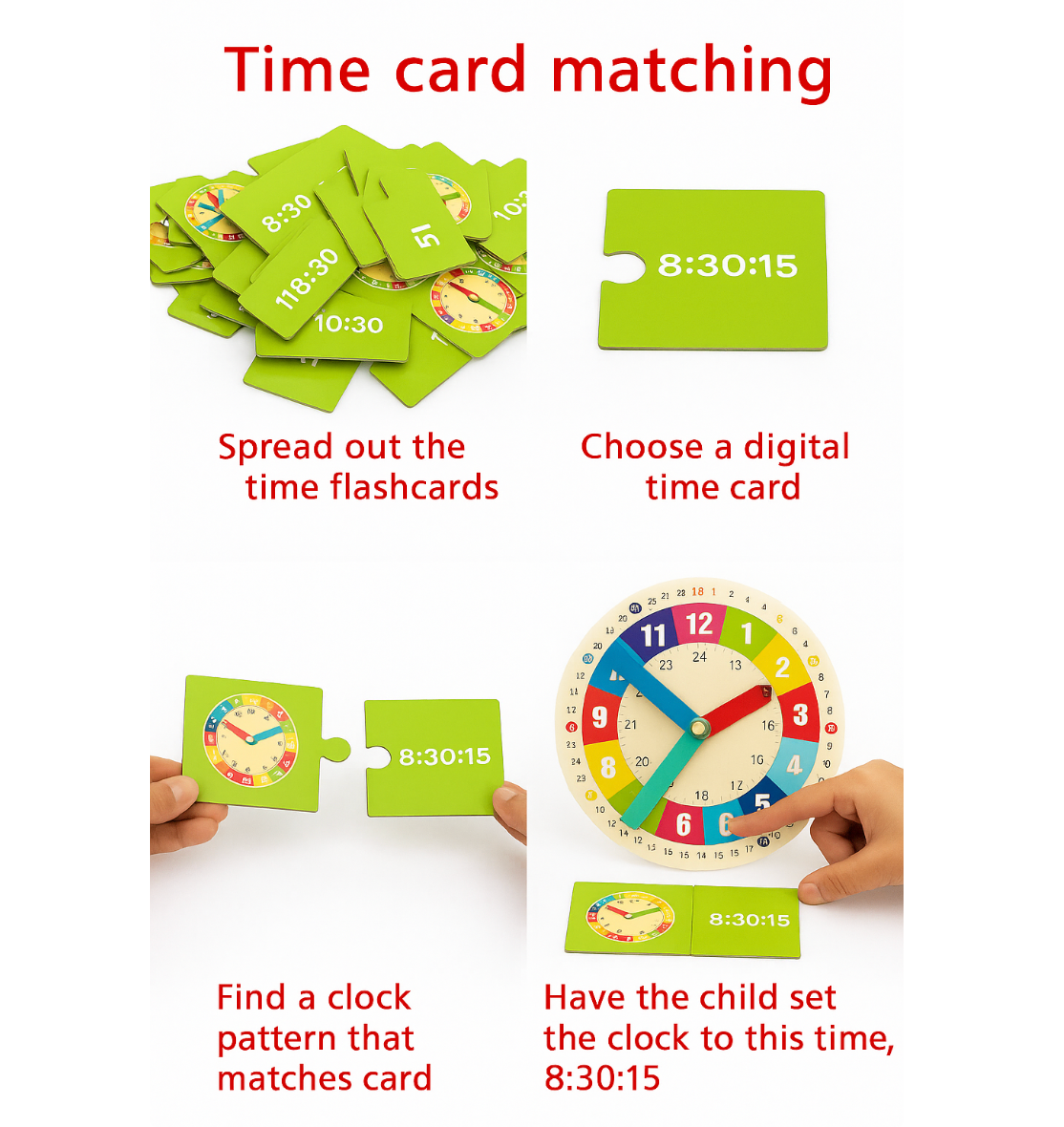 This educational clock game features movable hands, colorful dials, and includes 15 double-sided practice cards.