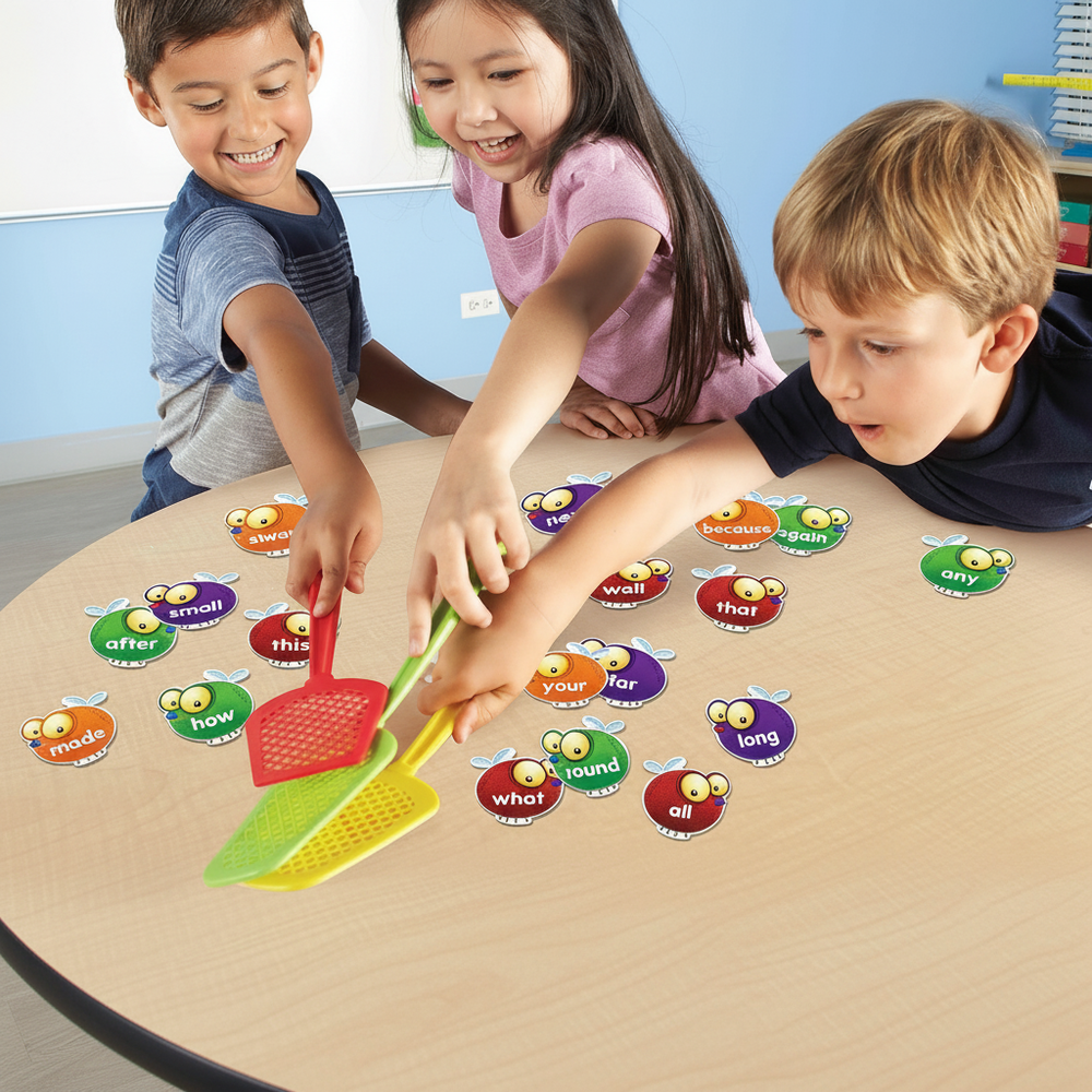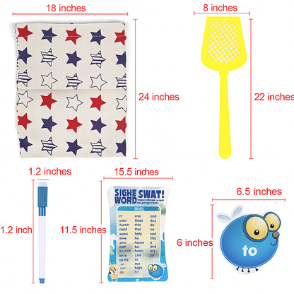 The game includes 112 double-sided sight word cards, 3 vocabulary cards, 4 sturdy swatters, and a storage bag for easy transport.