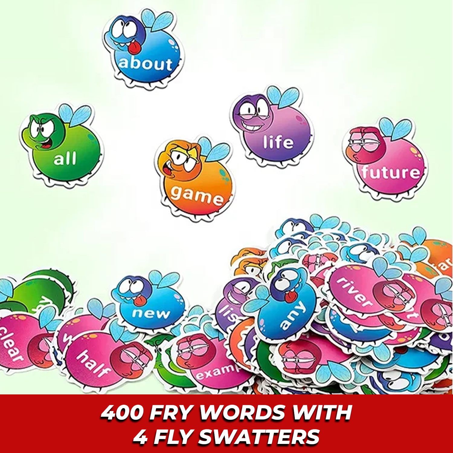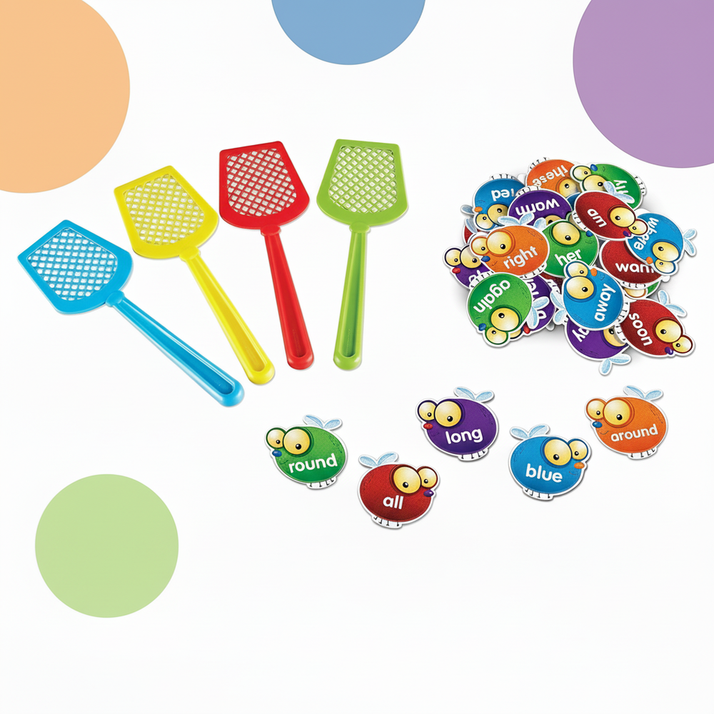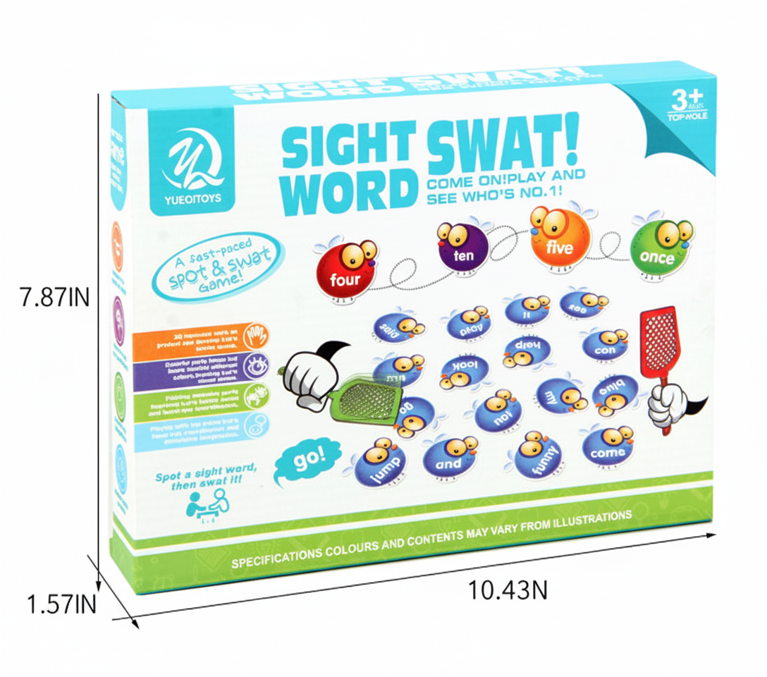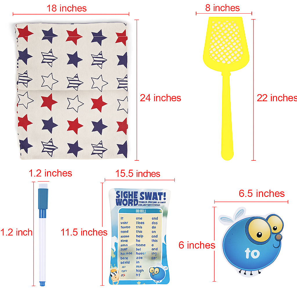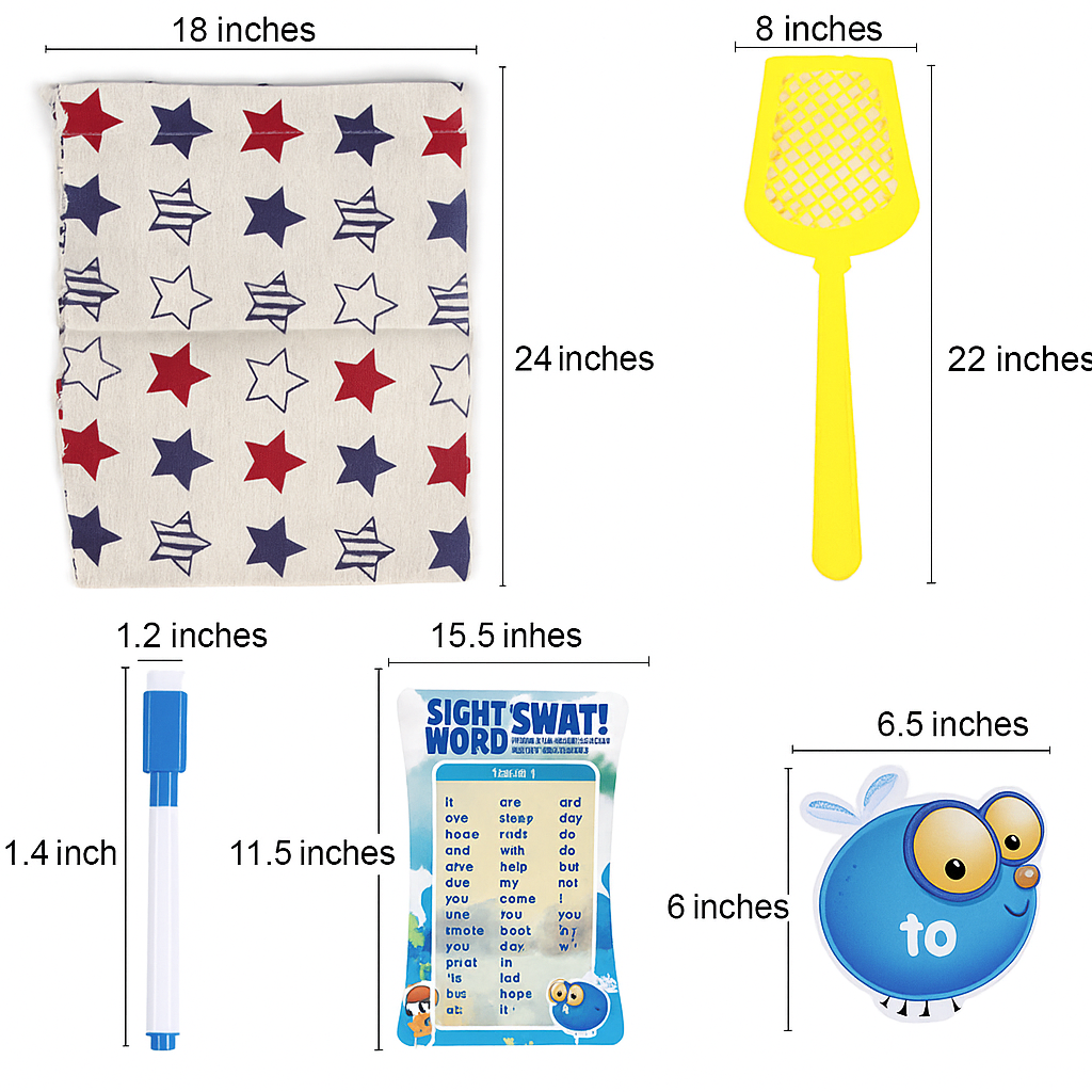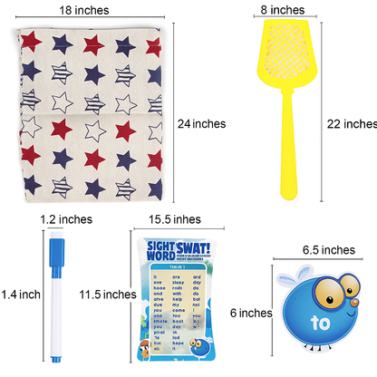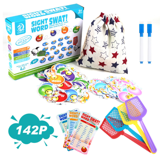 This game includes 112 sight word cards, 3 vocabulary cards across various levels, 4 sturdy swatters, and a storage bag.